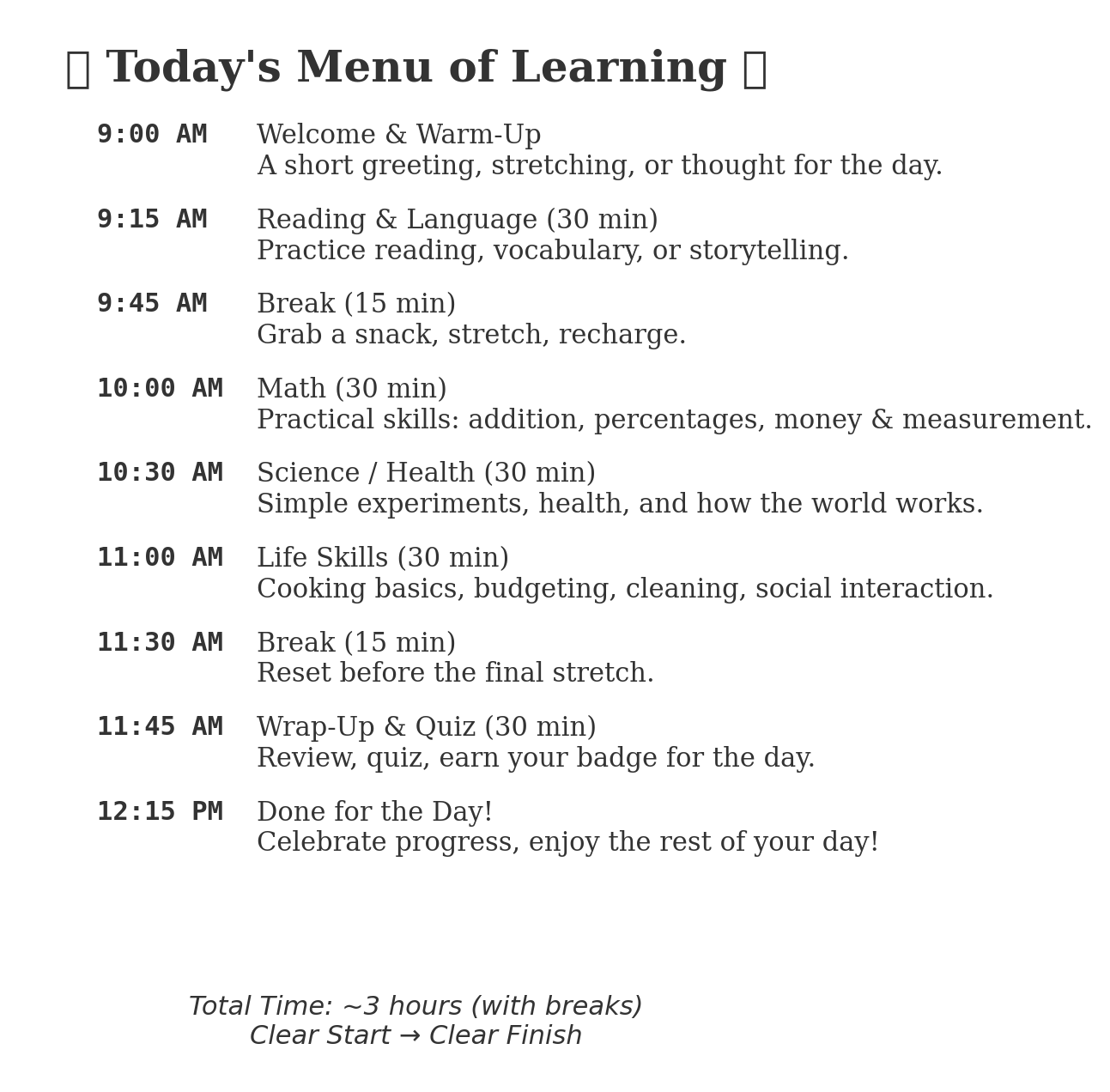 Our daily plans cover Reading, Math, Health, and Life Skills.